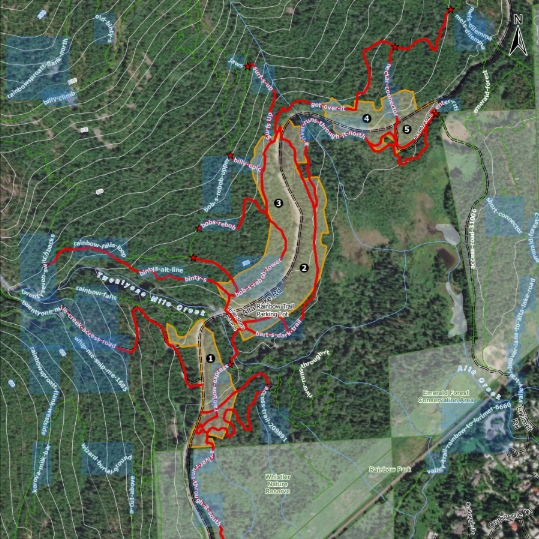 Unit 2 – Mid-late March through June. Bart’s Dark Trail will be closed for duration. RRTI North on to Bart’s Dark Trail will be diverted to Alta Lake Road. RRTI access trail will have 4-5 days closure during initial treatment.